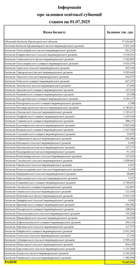Залишки освітньої субвенції станом на 1липня 2025 р.