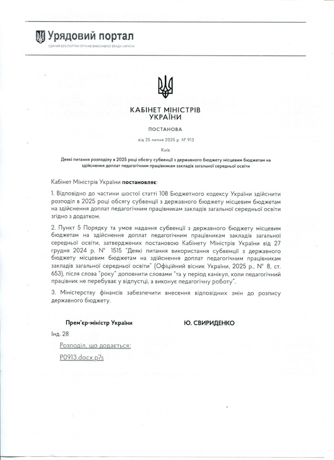 Внесено також зміни до пункту 5 Порядку та умов надання субвенції з державного бюджету місцевим бюджетам на здійснення доплат педагогічним працівникам закладів загальної середньої освіти, затверджених постановою Кабінету Міністрів України від 27 грудня 2024 р. № 1515 «Деякі питання використання субвенції з державного бюджету місцевим бюджетам на здійснення доплат педагогічним працівникам закладів загальної середньої освіти», згідно з якими за рахунок субвенції здійснюються видатки на виплату доплати протягом навчального року, а також у період канікул, коли педагогічний працівник не перебуває у відпустці, а виконує педагогічну роботу.