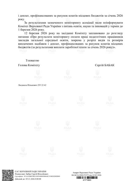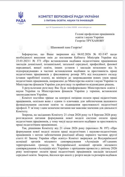 ✅ Також у листі зазначається, що Комітет ВРУ приділяє значну увагу питанню оплати праці педагогічних працівників, оскільки воно є одним із ключових факторів забезпечення стабільного функціонування системи освіти та підвищення престижності педагогічної професії.